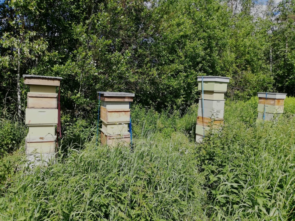 Tällä hetkellä Kielomäen mehiläispesät ovat kahdella tarhapaikalla – kotitarhan lisäksi muutaman kilometrin päässä pölyttämässä mansikka- ja vadelmaviljelmiä puutarhojen ja metsäsaarekkeiden välissä.