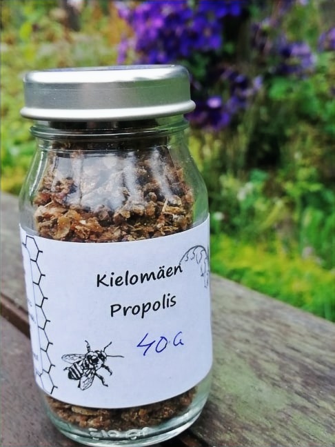 Mehiläiset keräävät puiden silmuista hartsiaineita, ja valmistavat niistä hyväntuoksuista ja tahmeaa kittivahaa eli propolista. Mehiläiset tykkäävät tilkitä kaikki raot ja kolot tällä antibakteerisella, pihkan kaltaisella aineella. Kalustoa huollettaessa rapsuttelemme propoliksen talteen. – Voisi propoliksen sinne jättääkin, mutta on se niin hyvää ainetta, että Kielomäessä se otetaan talteen!