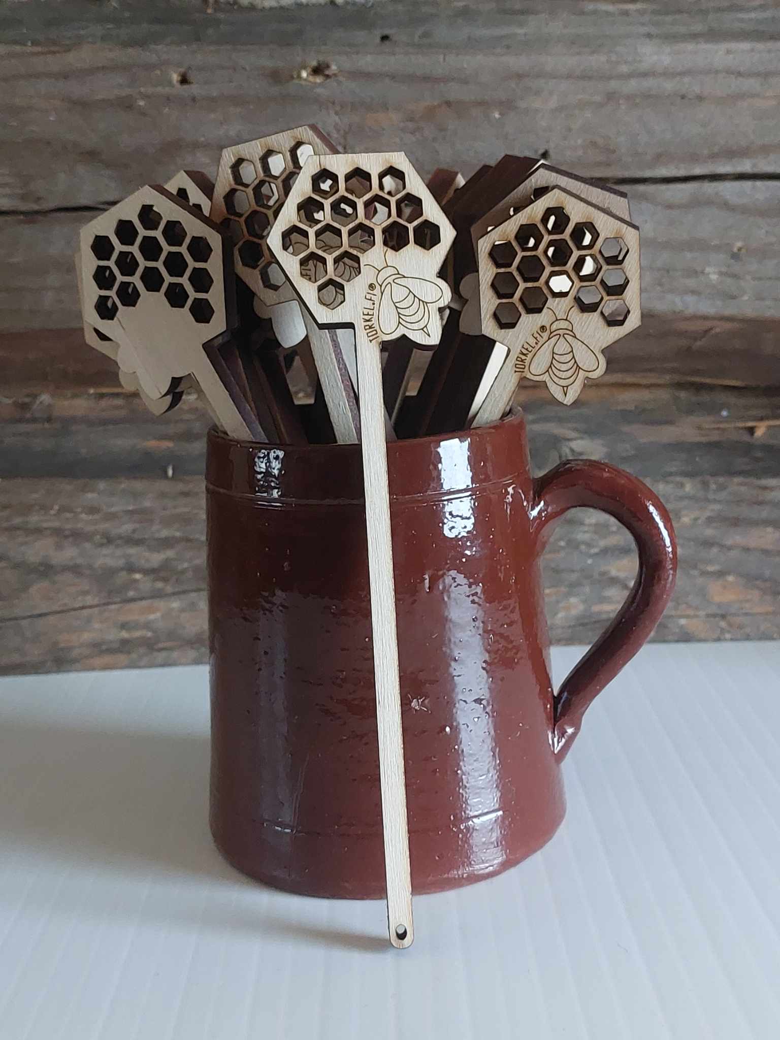 Nyt saatavilla on kouvolalaisen Torkel Designin hunajalusikka juoksevalle hunajalle. Tällä kauniilla kennokuvioidulla ottimella saat juoksevan hunajan siististi purkista käyttöön!