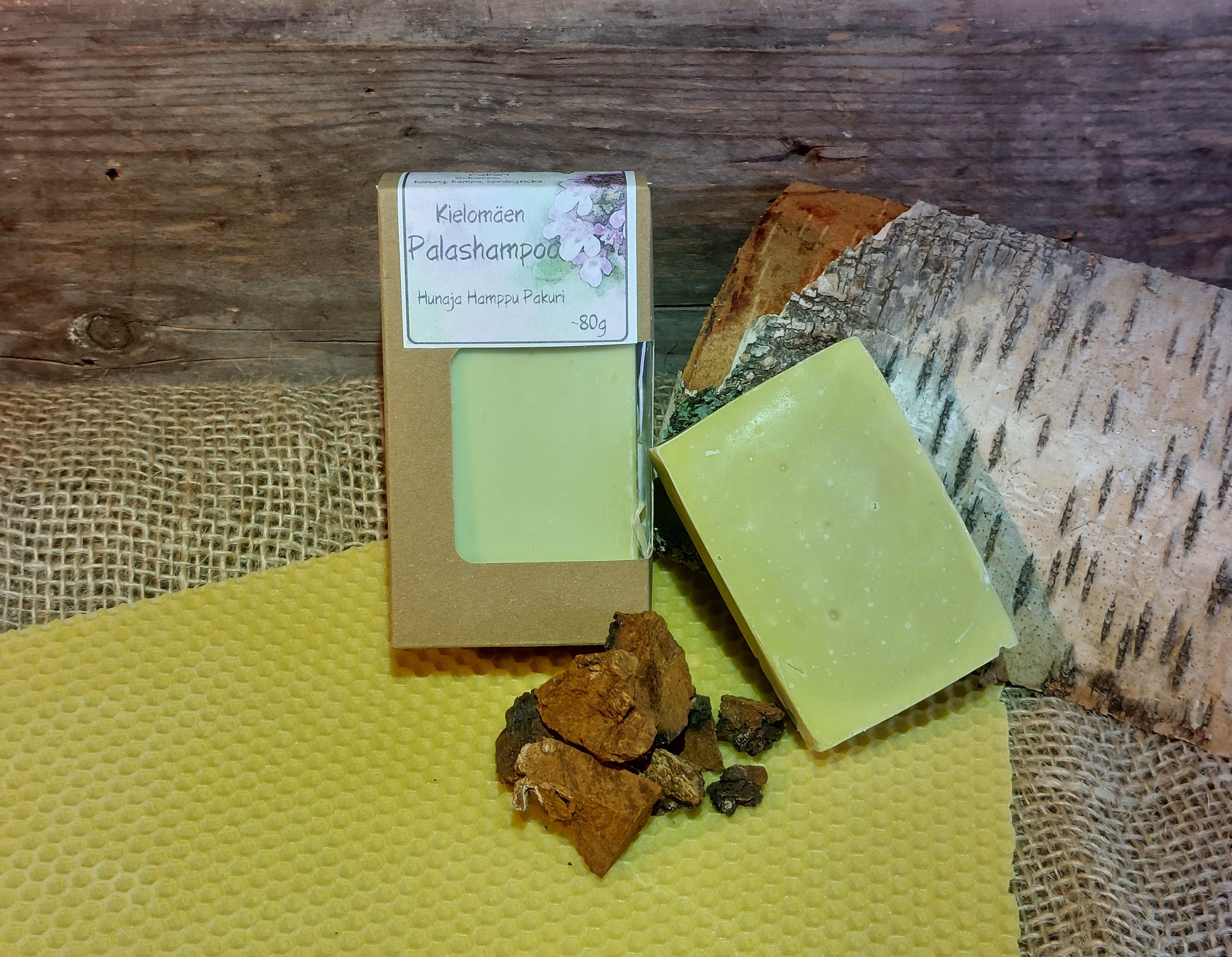 Koivun pakurikäävästä valmistettuun uutteeseen tehty palahampoo pesee hellävaraisesti hiukset ja koko vartalon. Pakurishampoo sisältää tuoksuna ainoastaan luonnon rosmariiniöljyä, joka rauhoittaa päänahkaa.