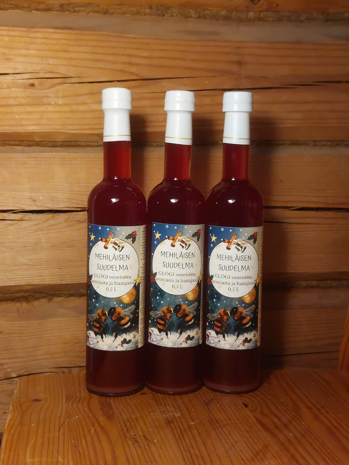 MEHILÄISEN SUUDELMA – glögi omenasta, aroniasta ja hunajasta. Valmistettu Imatralla, valmistaja Päivi-Angervo.